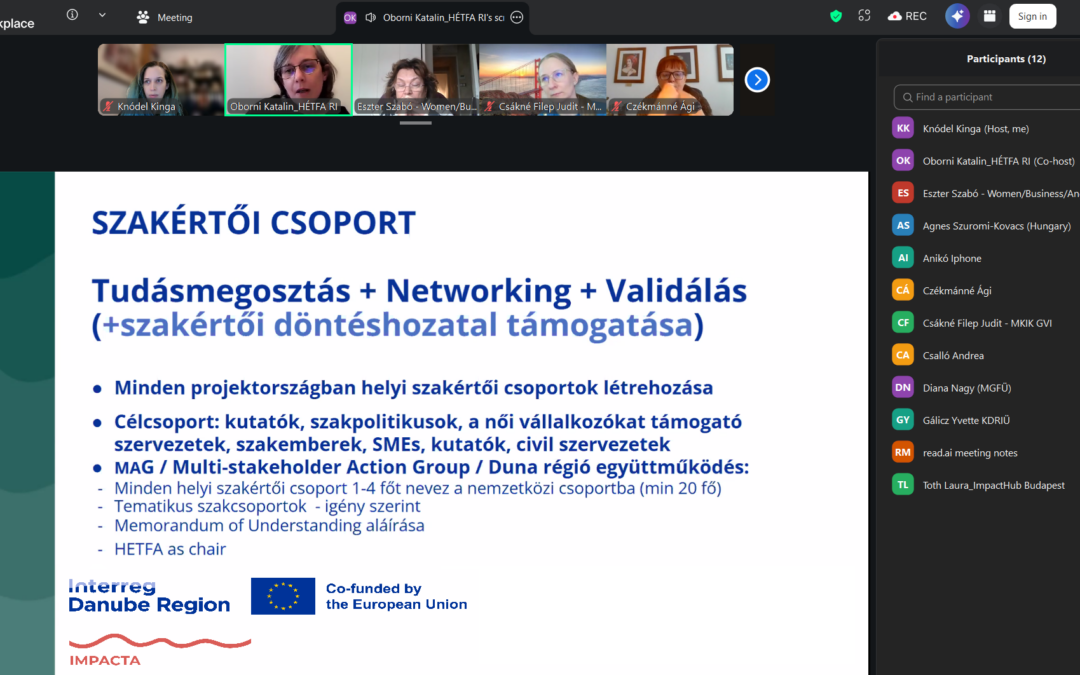 On 30 March, HETFA and WBA jointly held the first national IMPACTA stakeholder meeting online. Supported by the Interreg Danube Region Programme and implemented across seven countries, the IMPACTA project aims to foster the social integration of disadvantaged groups and promote gender equality by supporting women entrepreneurs operating in socially innovative sectors. The Hungarian partners of the project are Women Business Angels (WBA), which also serves as the project lead, and the HETFA Research Institute.